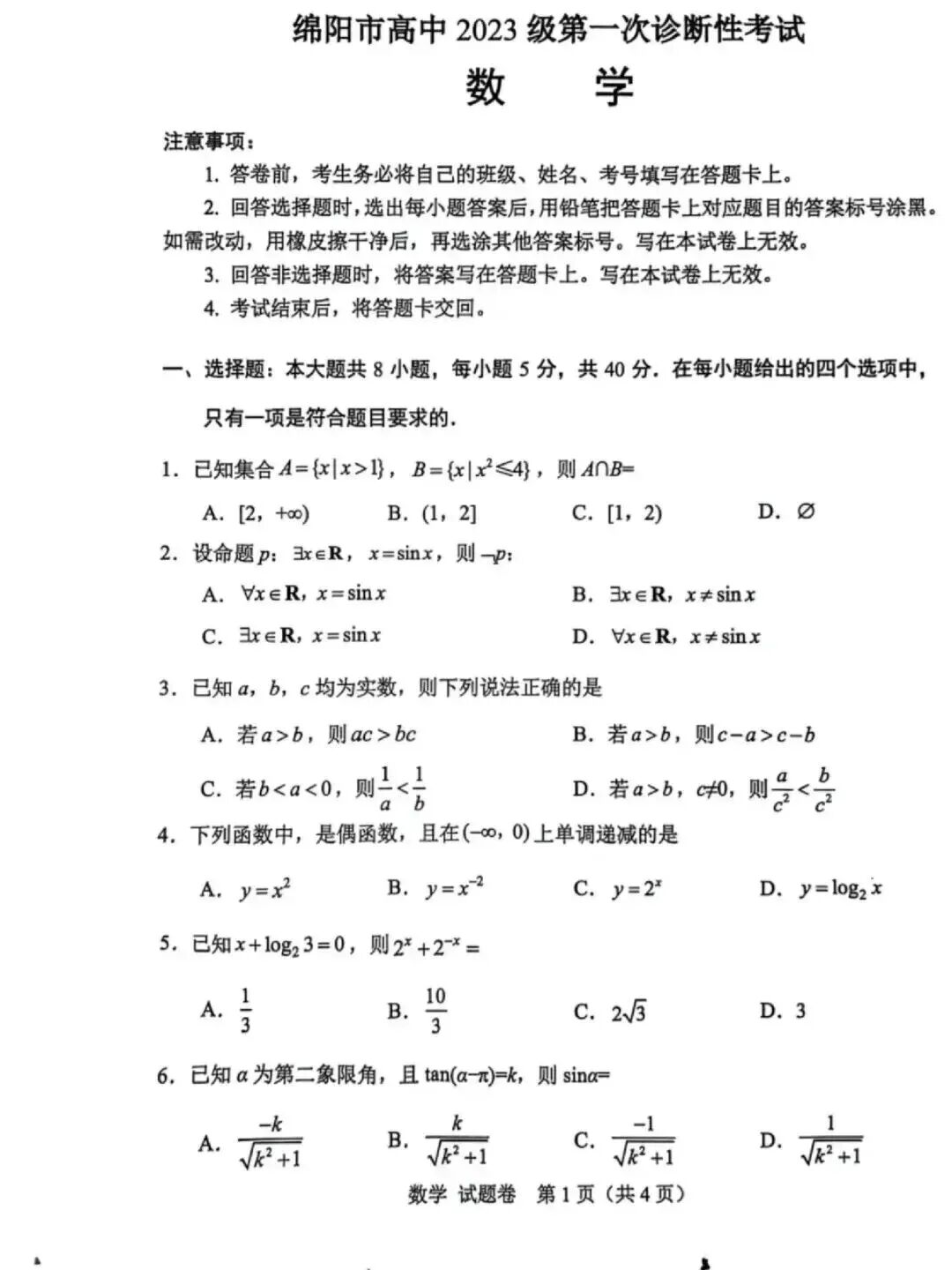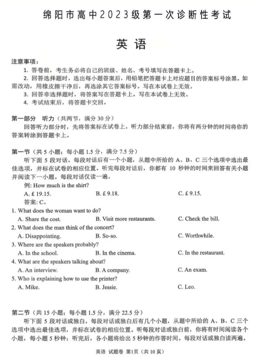 小编整理了相关试卷及答案,供有需要的同学们参考使用。因试卷较多,各位同学可点击上方蓝色字体关注“绵学堂”公众号,回复“绵阳一诊”即可免费领取本次诊断考试高清电子版试卷真题及答案!具体操作步骤如下: