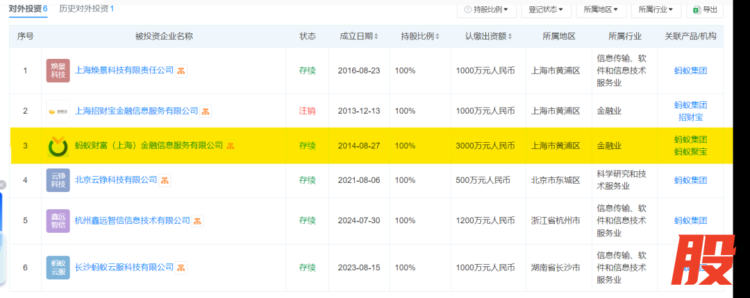 天眼查显示,上海云进信息技术有限公司成立于2016年,位于上海市,是一家以从事软件和信息技术服务业为主的企业。股东方面,蚂蚁科技集团股份有限公司100%控股上海云进信息技术有限公司。上海云进信息技术有限公司旗下拥有6家子公司,均为100%控股,蚂蚁财富(上海)金融信息服务有限公司就是其中一家。