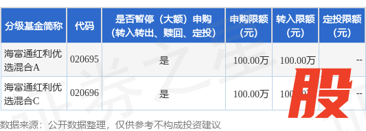 本站消息,10月18日海富通基金管理有限公司发布《海富通红利优选混合型证券投资基金暂停大额申购和转换转入业务的公告》。公告中提示,为保护基金份额持有人利益,自2025年10月20日起海富通红利优选混合型证券投资基金暂停大额申购和转换转入业务,申购、转换转入上限金额为100.0万元,下属分级基金调整明细如下: