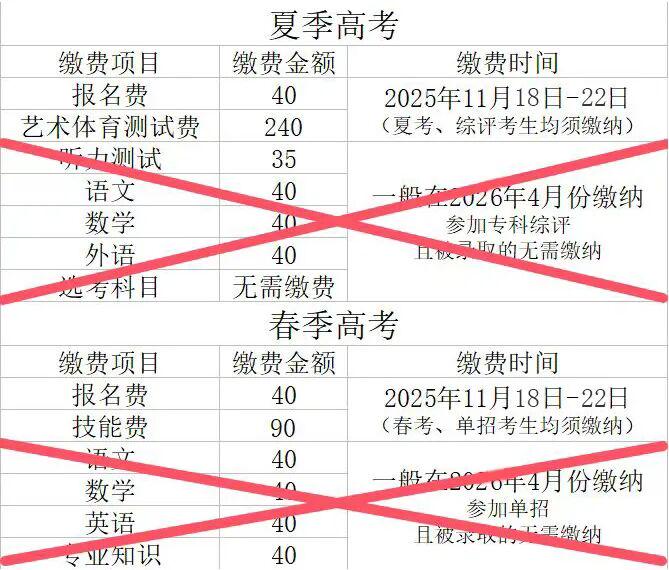 一、普通高校招生考试收费继续按以下标准执行:报名费每生40元(仅限普通高校招生考试收取);语文、数学、外语(不含听力和口语测试)等普通高校招生考试统考科目,以及综合科目(专业知识)考试费均为每生每科40元;外语听力测试和口语测试费均为每生35元,外语口语测试为自愿选择;艺术、体育类专业报名考试费每生240元,复试费每生80元。春季高考技能报名考试费每生每次90元。对普通高中的建档立卡家庭经济困难学生、低保家庭学生、特困救助供养学生、家庭经济困难残疾学生免收上述费用。