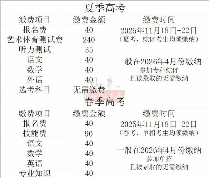 春季高考:需要在第一次缴纳130元(报名费+技能考试费),第二次缴纳160元。(语数外+专业知识)