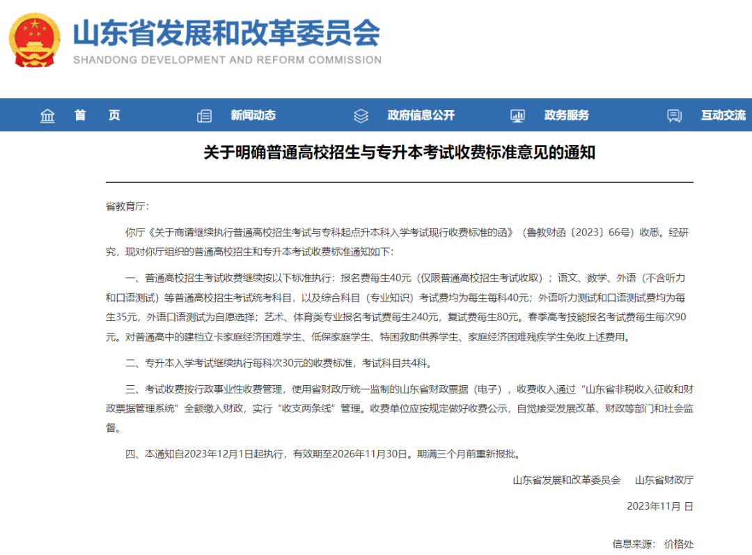 2023年11月山东发改委公布了关于明确普通高校招生考试收费标准意见。